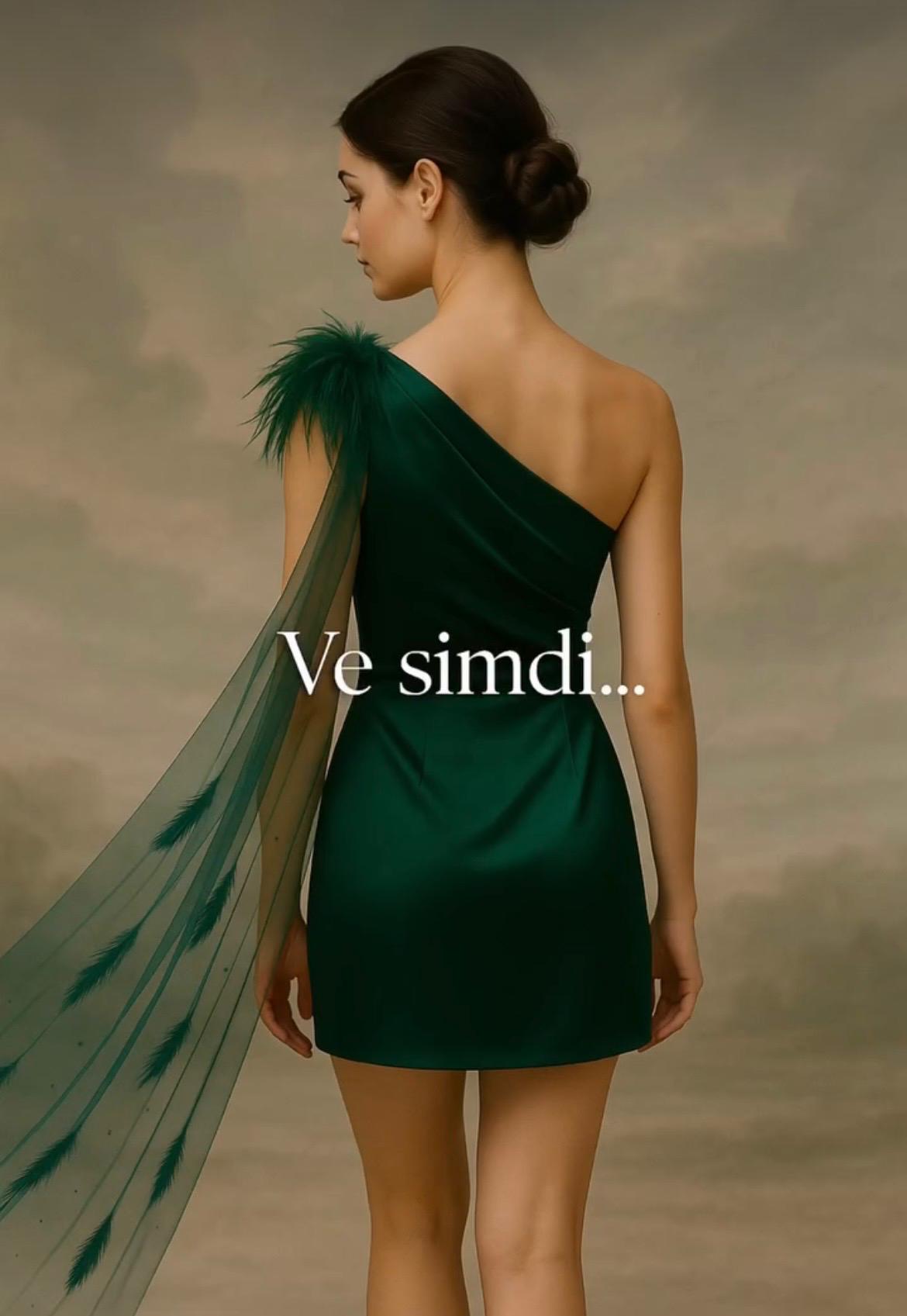 Bu tasarım; satenin pürüzsüz dokusunu, tülün uçuşan hafifliği ve tüy detaylarının zarafetiyle bir araya getiriyor. Tek omuz kesimi ve drape detaylarıyla zenginleşen silüet, modern bir şıklığın yansımasıdır.
